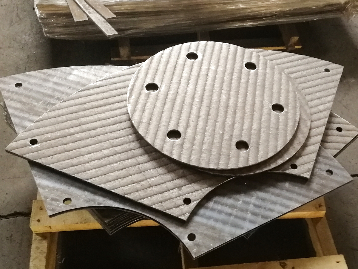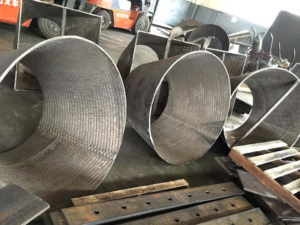 送粉机叶片、立式搅拌机内衬、冲击盘、管道、泵壳、磨机内衬、破碎机零件、出渣槽、各种底盘、震动筛板、布料器、传送道、分离器、风机壳体、切削刃、挤压辊堆焊、磨辊堆焊等。